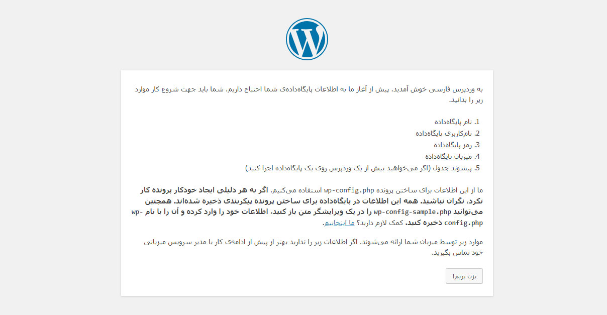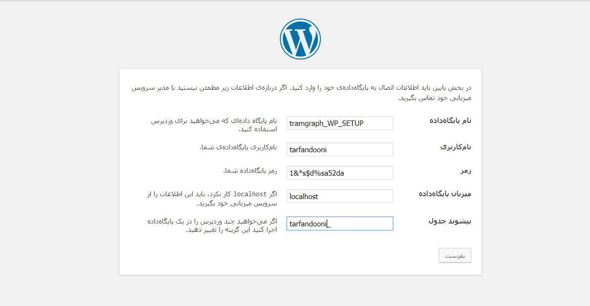 - بعد از انتخاب زبان ، می بایست نام پایگاه داده و نام کاربری و رمز عبور پایگاه داده ی خود را وارد کنید.