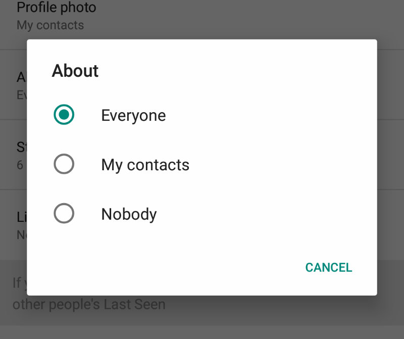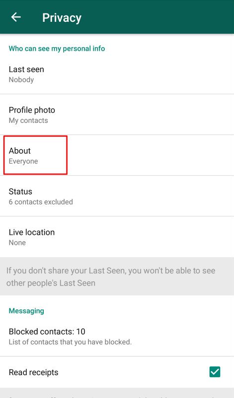 WhatsApp “About” مانند بیانیه شخصی است. ممکن است تعداد زیادی از افراد دارای یادداشتهای حساس باشند که در بیانیه نوشته شده اند ، به این معنی که نمی خواهند همه بتوانند آن را مشاهده کنند. اگر در این گروه قرار گرفتید ، مراحل زیر را دنبال کنید.