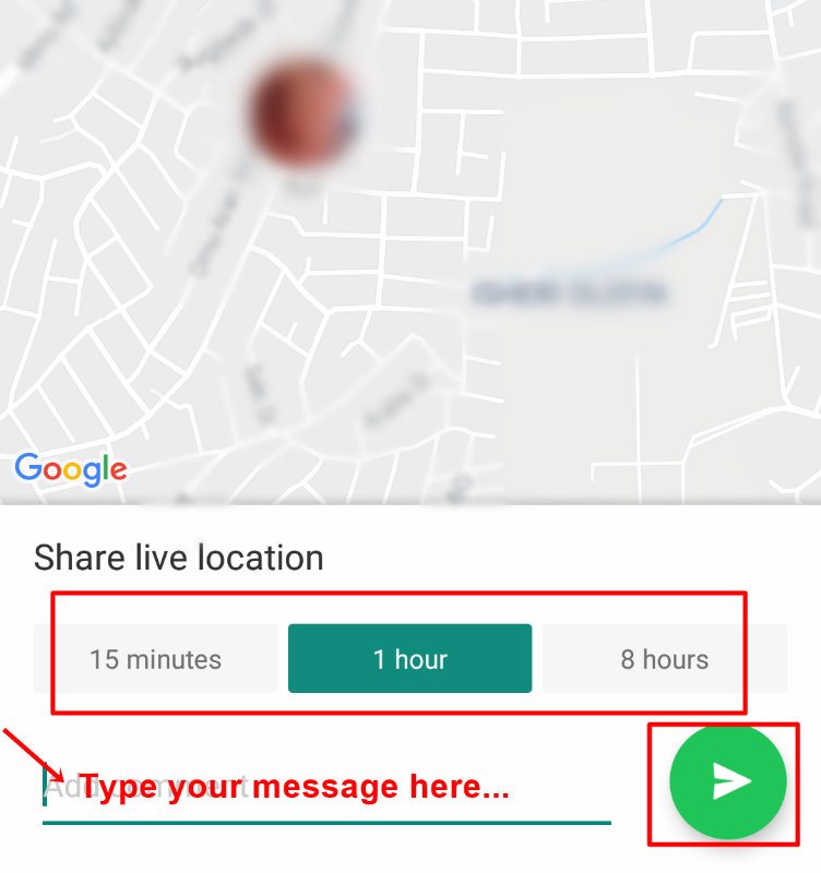 3 .بر روی “Share live location” کلیک کنید و محدودیت زمانی را انتخاب کنید. پیام های اضافی را اضافه کنید ، سپس دکمه “Send” را کلیک کنید.
