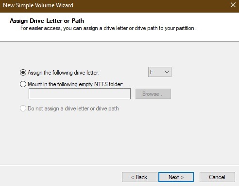 به محض مشاهده مرحله بعدی ، “assign drive letter” را انتخاب کنید که به شما کمک می کند بار دیگر درایو usb خود را مشاهده کنید. من “F” را مطابق تصویر اینجا انتخاب کردم.