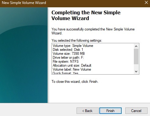 برای تکمیل volume wizard which حجم جدید که اکنون به درایو USB اختصاص یافته است ، روی “پایان” کلیک کنید.